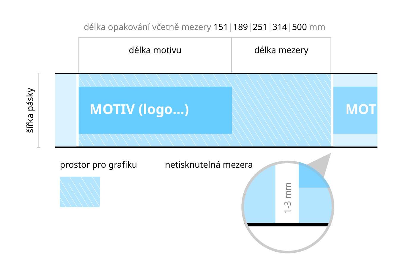 Příklad: Na plátno délky 151 mm umístíte logo délky 110 mm. Mezera mezi opakováním grafiky tak bude 41 mm (151 - 110).