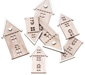 Dřevěné domky ve dvou velikostech jsou skvělým doplňkem pro různé kreativní práce pro různá roční období a příležitosti. Všechny prvky jsou v přírodní dřevěné barvě s bílou povrchovou úpravou střechy. Větší domy mají také bílá srdíčka. Tento univerzální vzor lze použít při scrapbookingových a cardmakingových projektech, jako jsou alba a přání. Lze je použít i pro jiné druhy ručních prací, jako je tvorba a zdobení věnců, či jiných interiérových prvků.