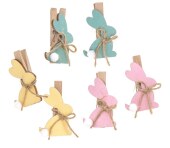 Dřevěné kolíčky se zajíčky ve třech jarních barvách: žluté, vavřínové a růžové jsou perfektním doplňkem k velikonočním projektům. Zajíčci mají nadýchané ocásky ve tvaru bambulky a ozdobné obojky z jutového provázku.