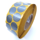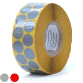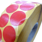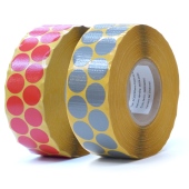 Lepící kolečka jsou vyseknuta ve dvou řadách vedle sebe, jsou nesena na silikonovém papíru a navinuta do role v počtu 4000 ks.