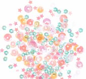 Směs flitrů ""Candy"" je úžasná kompozice skládající se z jedinečných tvarů a barev. Tato sada obsahuje až pět druhů flitrů. K dispozici jsou klasické, kulaté flitry ve čtyřech velikostech a barvách, stejně jako jemné hvězdičky a květiny. Flitry z kompozice 'Candy' zaujmou krásnými opalizujícími odstíny ve sladkých barvách: průsvitná, mléčná, mléčně růžová, světle růžová, mátová a medová.