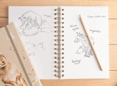 Kroužkový zápisník s pevnými ilustrovanými deskami a gumičkou k uzavření. Vhodný na psaní i kreslení. Formát A5, 96 prázdných listů. Motiv s králíkem.