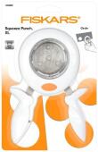 Ozdobná páková děrovačka Fiskars se ovládá stlačením dvou pák, dojde tím k pohybu raznice směrem nahoru. Výhodou je, že u této ozdobné děrovačky si můžete přesně umístit papír a máte přehled, kde přesně bude papír vystřižen. Touto metodou tak můžete přesně vystřihnout např. detail z fotografie nebo potištěného papíru.