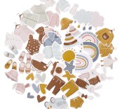 Třpytivé papírové tvary "Baby" kombinují tlumené pastelové barvy s dětskými vintage motivy. Patří mezi ně vzory oblečení, hračky, srdce, mraky a duhy. Nabízíme také třpytivé samolepky "Baby Boy" a "Baby Girl", které se perfektně hodí k prvkům této sady.