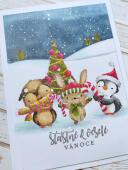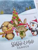 Přání ruční výroba - Tučňák, sova a zajíc - Šťastné a veselé