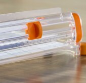 Řezačka papíru Fiskars umožňuje řezání papíru A4 na výšku i na šířku. Velikost A3 poté řeže na šířku. Unikátní linie pro přesné řezy s vyznačením metrických i palcových rozměrů. Snadná a bezpečná výměna řezacího kolečka. Řezačka je vybavena přídavným vyklápěcím pravítkem a má pogumované nožky pro dobrou stabilitu. Možnost řezu až 10 papírů najednou (80g/m2). U řezačky dochází při práci ke kontaktu řezacího kolečka s plastovou lištou, která je umístěna pod ním. Po určité době, kdy je řezačka používána je nutno otáčet plastovou lištu, aby byl zajištěn stále čistý řez. Lišta má 4 pozice pro otáčení. Po použití všech 4 pozic je nutno lištu vyměnit za novou.