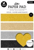 Třpytivé papíry na kreativní tvoření. Celkem 24 listů ve 4 barvách: sytá zlatá, světlá zlatá, stříbrná a černá. Třpytivý papír formátu A5 má gramáž 200 g/m2.