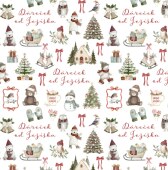 Tento vánoční balicí papír pod vašim vánočním stromečkem vyčaruje kouzelnou atmosféru. Papír je plný ručně malovaných obrázků. Najdete na něm medvídky, sovičky, ptáčky, dárečky i vánoční stromečky. Dokonce se na vás usměje sněhulák a určitě při pohledu na tento balicí papír dostanete chuť na horké kakao :)