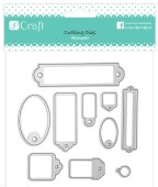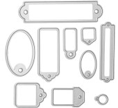 Sada raznic pro vyřezání univerzálních štítků z papíru, kartonu a pěny. Skládá se z deseti výseků na visačky v různých velikostech a provedeních.